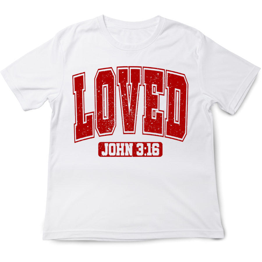 Wear your faith boldly in this striking Gildan Heavy Cotton Tee. The design features the word “LOVED” in bold, distressed red lettering, paired with the powerful reference “JOHN 3:16” — a timeless reminder of divine love, sacrifice, and grace. The collegiate-style font evokes strength and legacy, making this shirt a statement of both identity and belief.